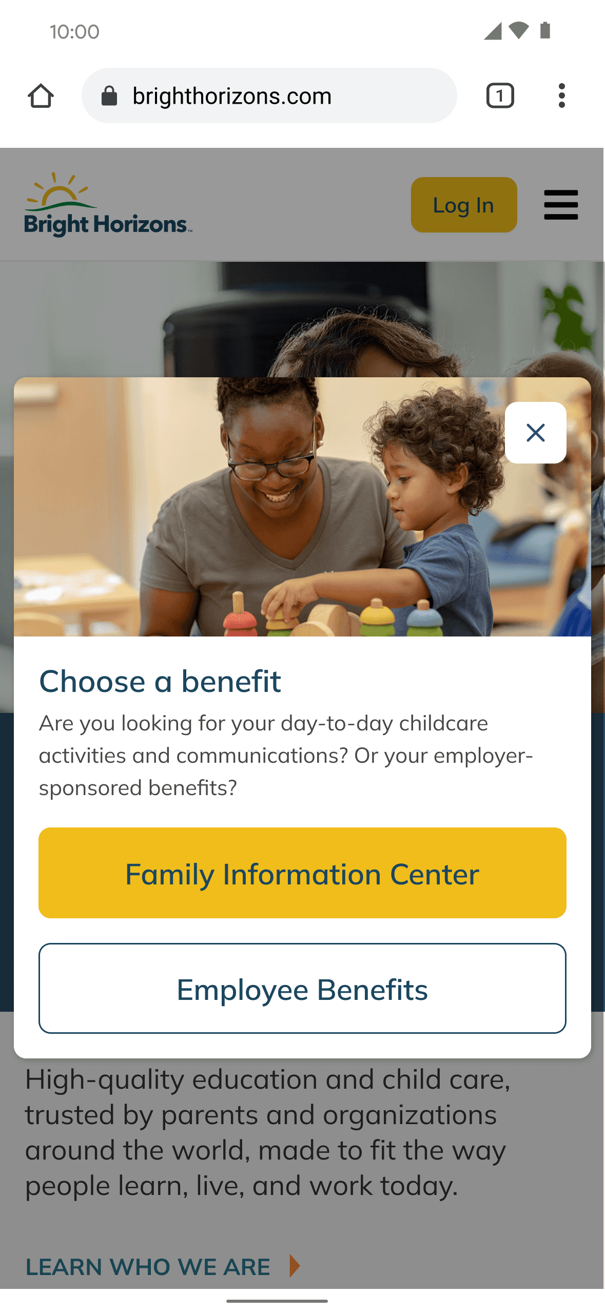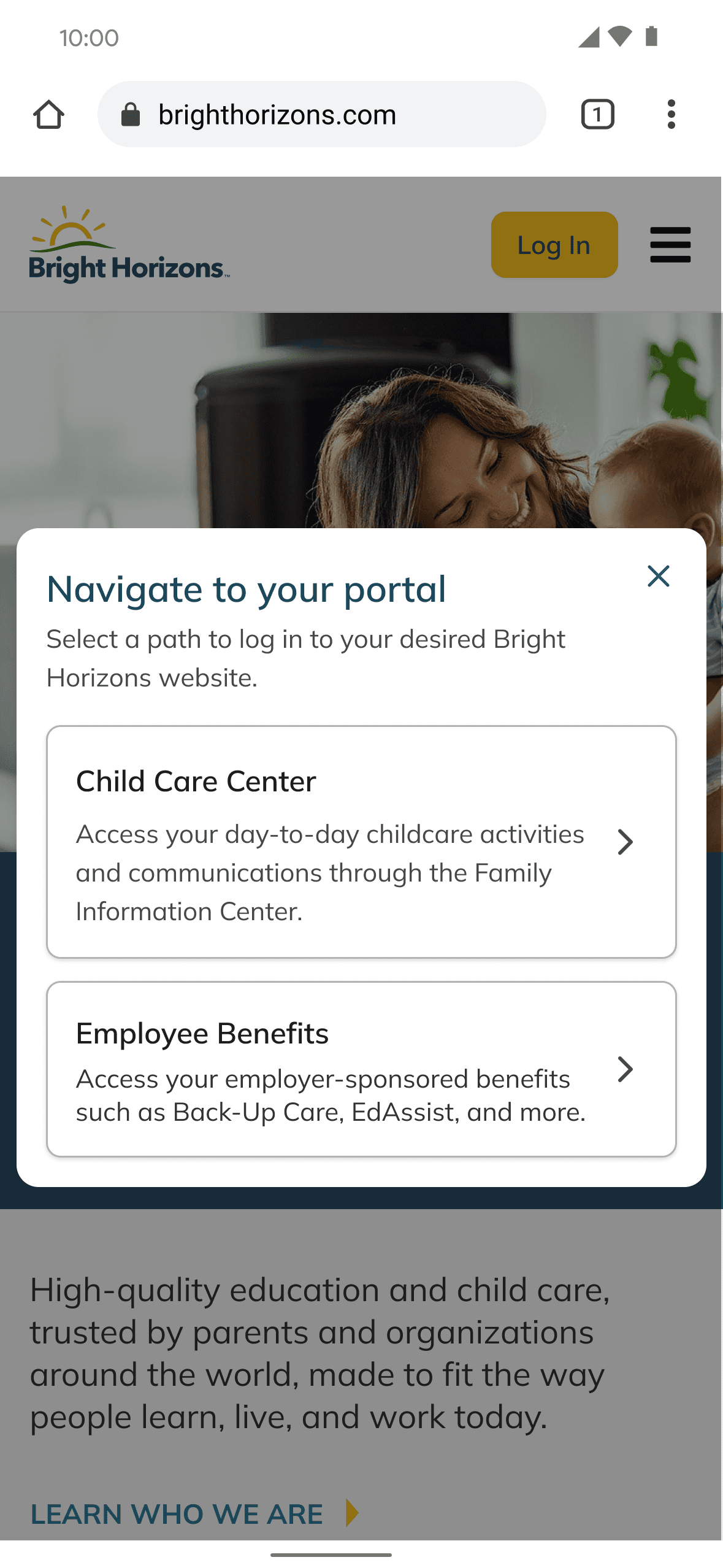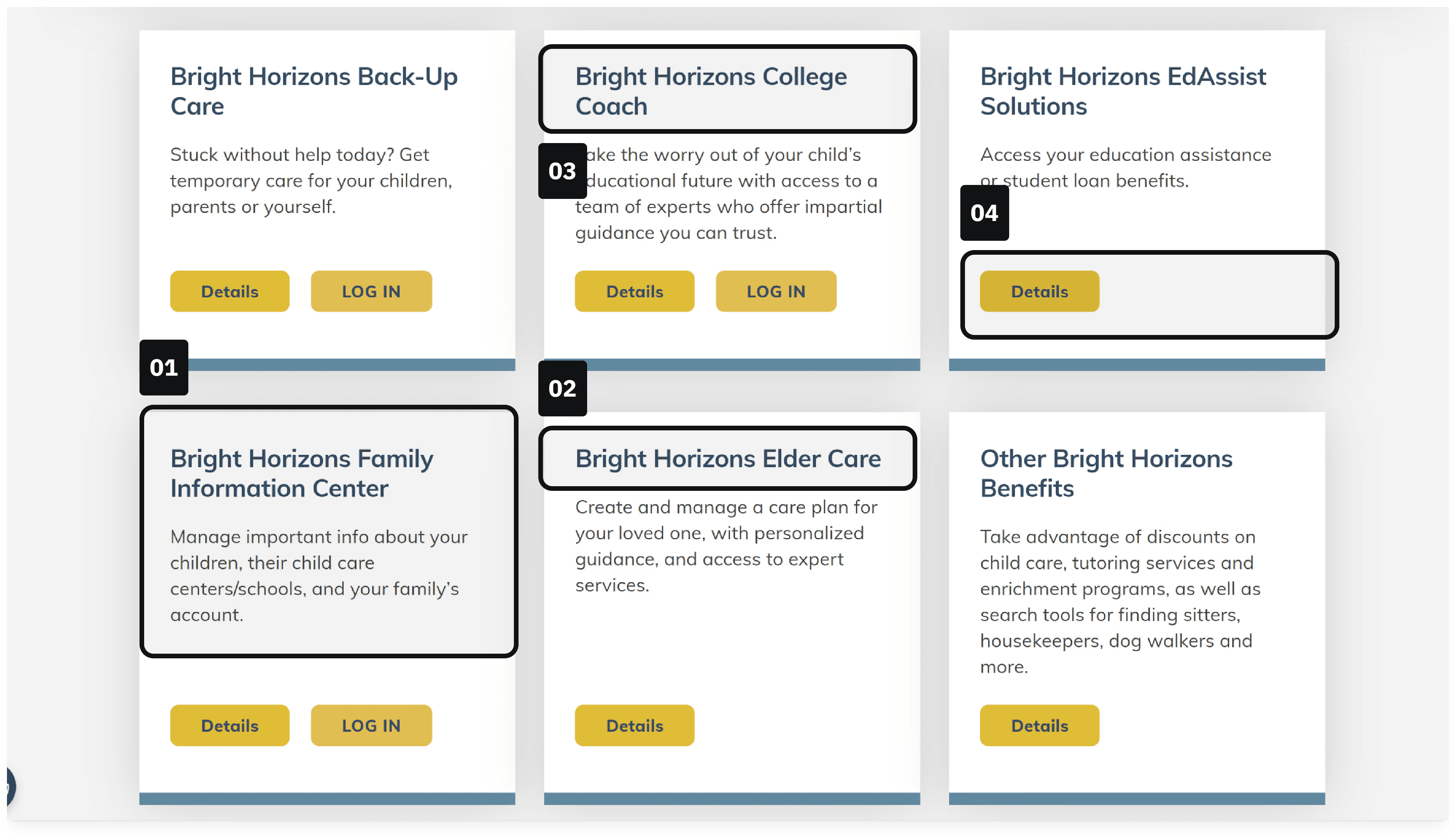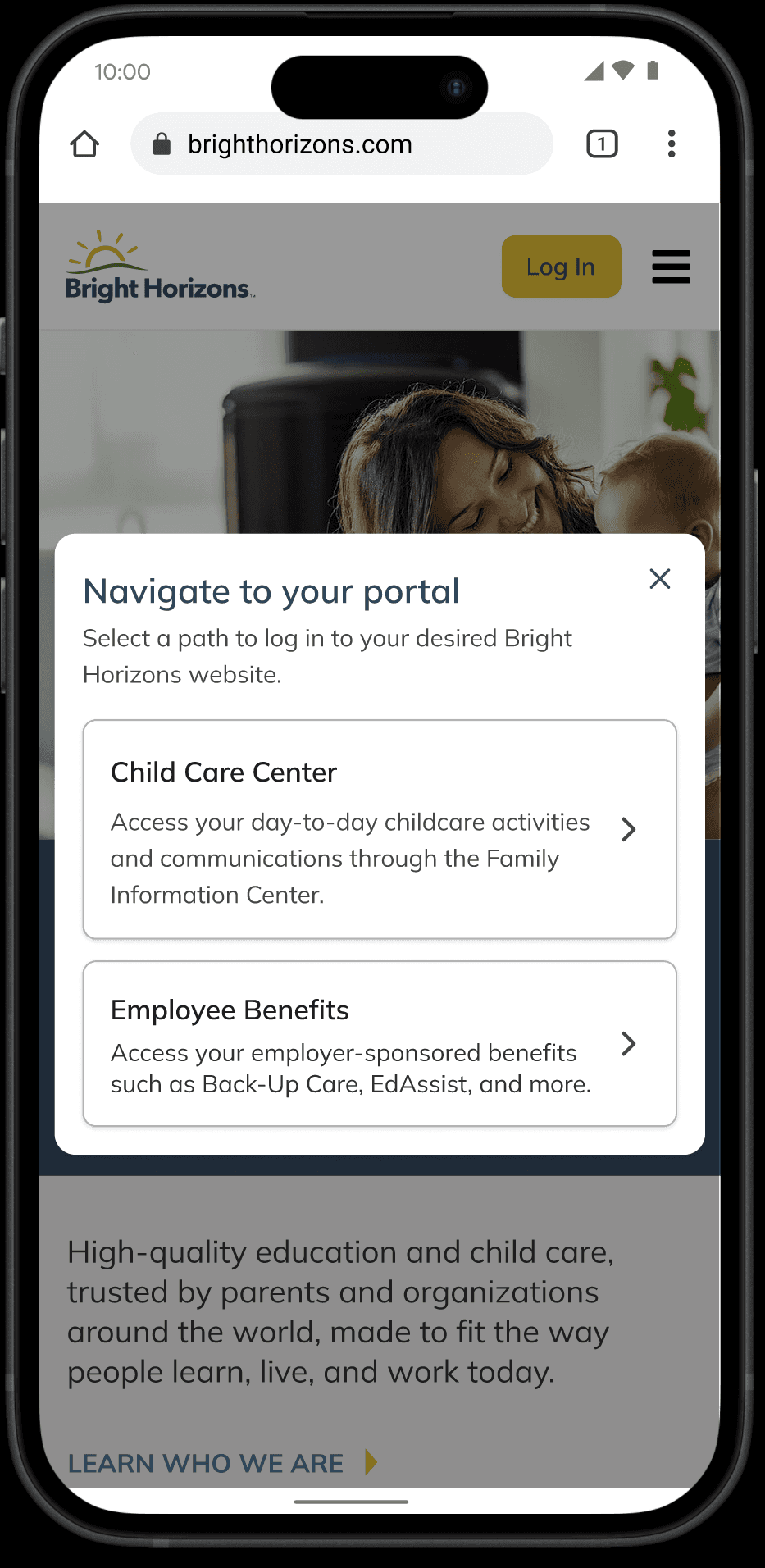 Employees arriving at BrightHorizons.com to access childcare benefits couldn't figure out how to log in. The homepage presented multiple portals, confusing terminology, and competing calls to action — none of which clearly pointed to the right login path.