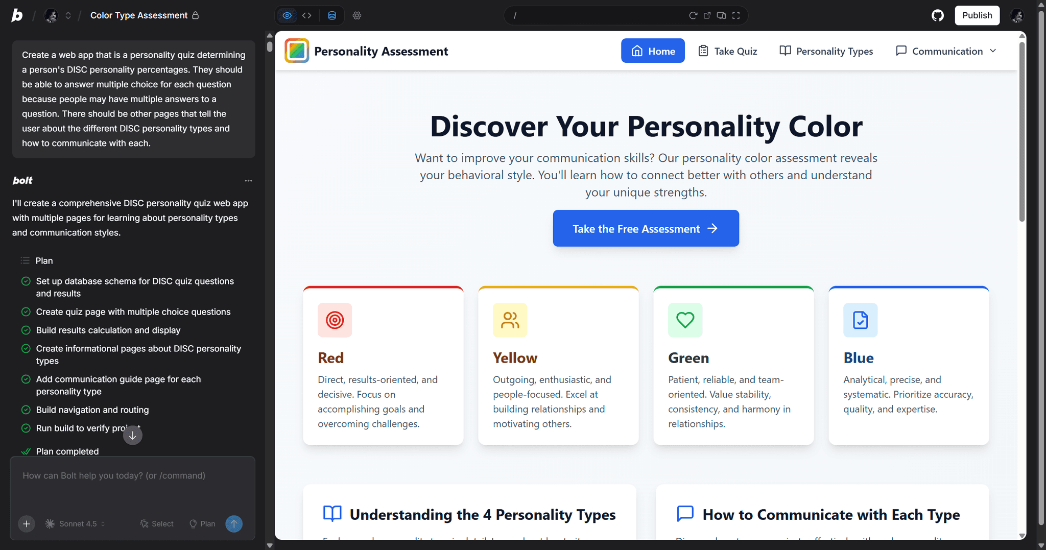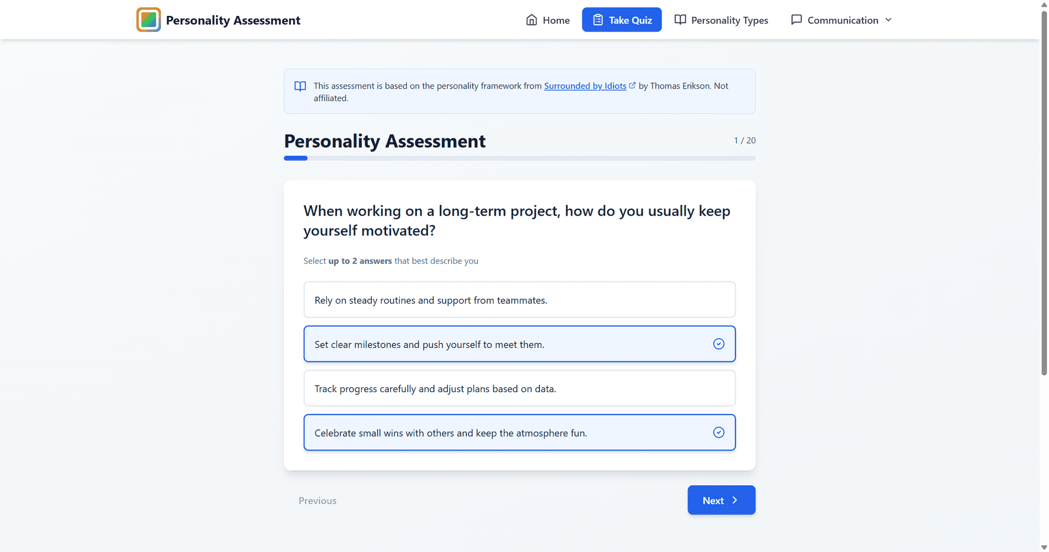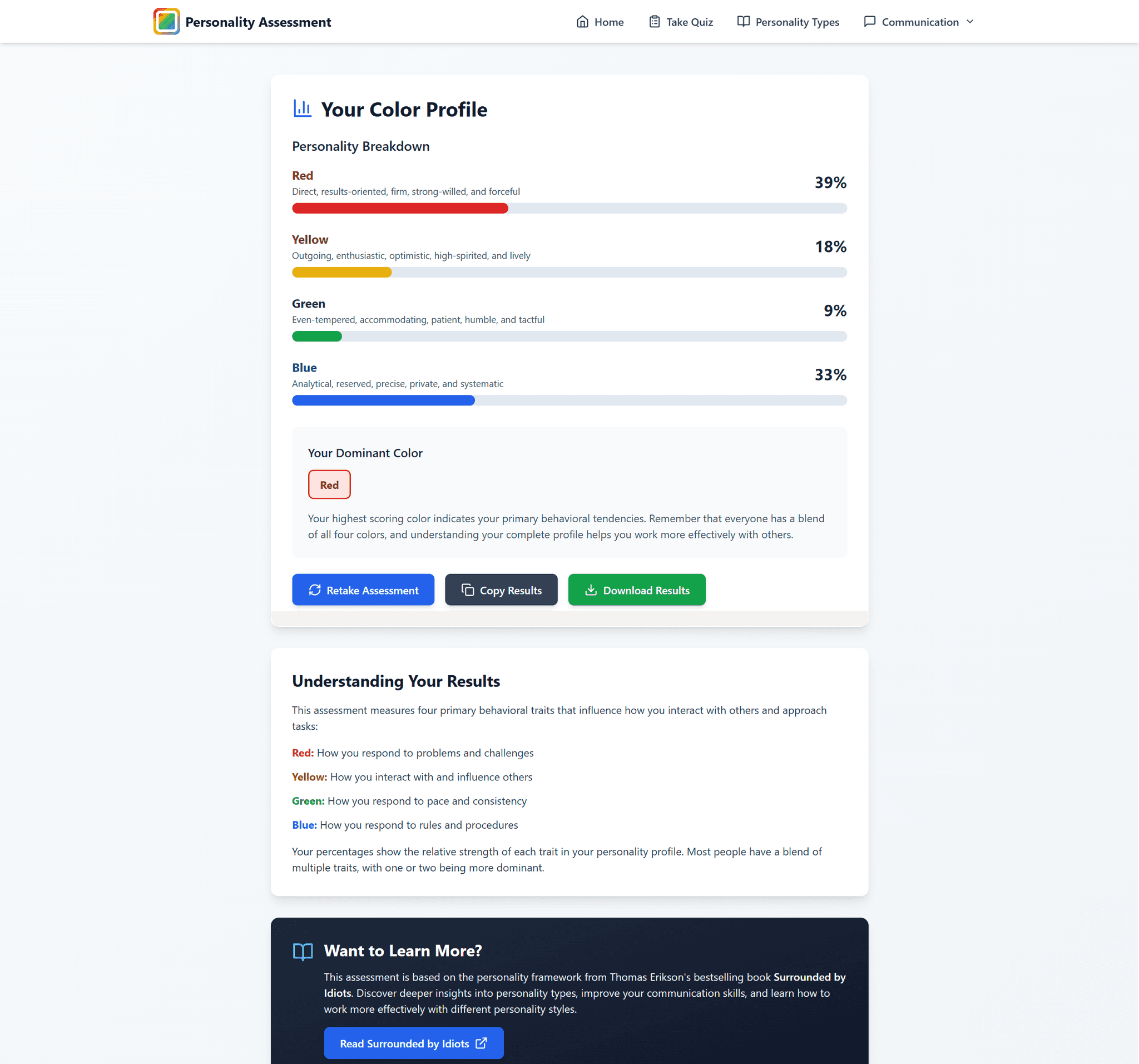 Usually, after finishing a great book, I create summary posters to capture the key ideas and share them with others. This time, inspired by Surrounded by Idiots by Thomas Erikson, I decided to try something different—I built a personality quiz website! The book offers a fascinating framework for understanding different communication styles and personality types through four color-coded profiles. It's helped me better understand myself and others, and I wanted to share that insight in a fun, interactive way.